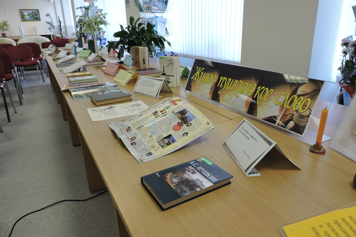 В начале мероприятия звучала прекрасная мелодия, которая взволновала всех присутствующих и настроила на лирический лад. На книжно-журнальной экспозиции «Живое пушкинское слово» были представлены произведения А. С. Пушкина, ксерокопии его иллюстраций и рукописных страниц, высказывания великих людей о творчестве поэта. Дополняли выставку символичные предметы: свеча, перо и чернильница. Все это помогло окунуться в атмосферу пушкинской эпохи, почувствовать дыхание того времени.