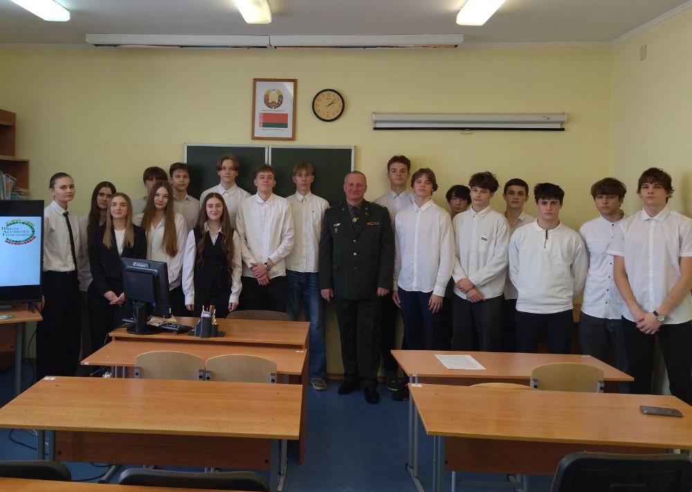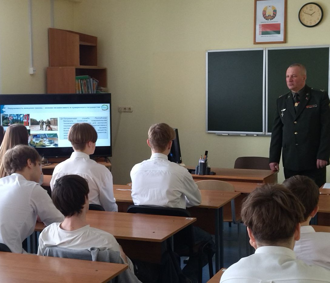 29 января рамках проекта «Школа активного гражданина» прошли мероприятия «Быть достойным гражданином Республики Беларусь – значит быть готовым в любую минуту встать на защиту Родины». В качестве информационной основы мероприятий «ШАГа» использовались материалы, подготовленные Национальным институтом образования. На первом этапе «МЫ УЗНАЁМ» актуализировались знания учащихся по теме мероприятия. На втором этапе «МЫ РАССУЖДАЕМ» гостем мероприятия в 11 "Г" классе стал Бирюков Сергей Николаевич, заместитель председателя Пинской городской организации общественного объединения "Белорусский союз ветеранов органов пограничной службы", полковник запаса. В ходе открытого диалога Сергей Николаевич остановился на нескольких важных моментах: своей военной династии: рассказал, что вырос в семье военного, сам посвятил жизнь службе, и трое его детей, включая дочь, пошли по его стопам; своём пути: в сложные годы перестройки он начал службу в органах МВД, где в составе подразделения добился успехов в борьбе с экономической преступностью, пополнив бюджет государства значительной суммой денег; службе на границе, современном оснащении и высокой готовности пограничников противостоять любым провокациям; подчеркнул масштабную модернизацию войск, обновление вооружения и техники, а также высокую численность и возросший уровень подготовленности военнослужащих; объяснил, как спортивные достижения могут стать преимуществом при поступлении в военные вузы или прохождении службы.