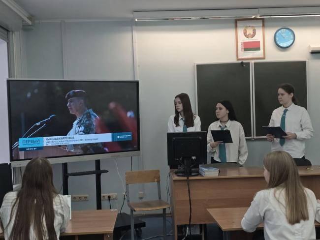 Учащиеся других классов также активно включились в работу. В формате открытых диалогов вместе со своими классными руководителями они обсудили предложенную тему, поделились своими мыслями о Вооруженных Силах Беларуси как гаранте национальной безопасности страны; о военной службе как школе мужества; об учебных заведениях, готовящих военных специалистов; о роли военно-патриотических клубов в патриотическом воспитании молодежи.