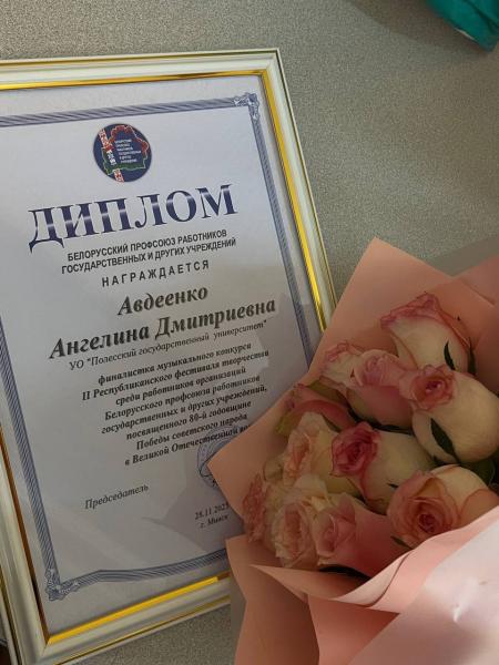 Студентка Полесского государственного университета, председатель студенческого совета биотехнологического факультета Авдеенко Ангелина, стала финалисткой музыкального конкурса "Финансовая феерия", который проходил в рамках II Республиканского фестиваля среди профсоюзных организаций Белорусского профсоюза работников государственных и других учреждений.