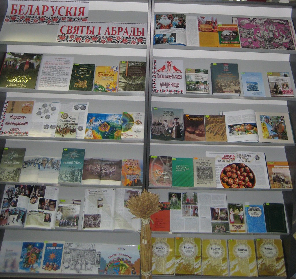 В читальном зале библиотеки учебного корпуса №1 экспонируется книжная выставка «Беларускiя святы i абрады». На выставке представлены научно-популярные издания, энциклопедии, монографии, периодические издания, раскрывающие этнокультурные традиции, истоки и этническое развитие белорусского народа.