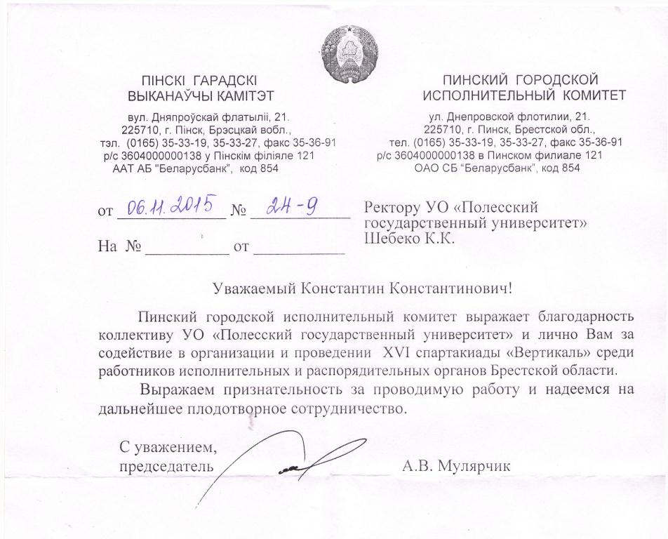 Благодарность Полесскому государственному университету от Пинского городского исполнительного комитета