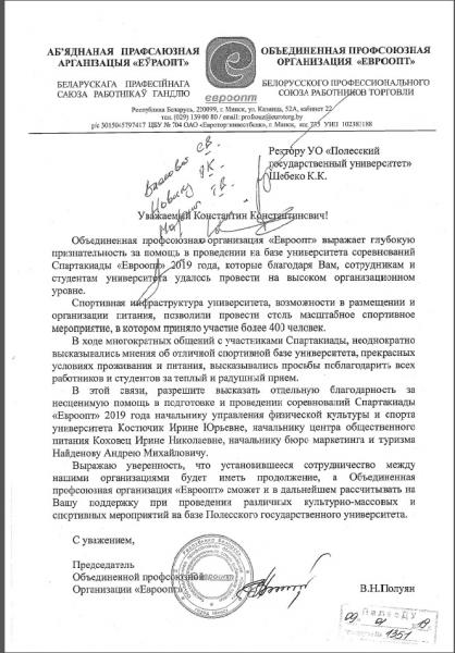 Объединенная профсоюзная организация «Евроопт» выражает благодарность за помощь в проведении на базе Полесского государственного университета Спартакиады «Евроопт» 2019 года ректору университета Шебеко Константину Константиновичу, начальнику центра ФКиС Костючик Ирине Юрьевне, начальнику центра общественного питания Коховец Ирине Николаевне, начальнику бюро маркетинга и туризма Найденову Андрею Михайловичу и студентам-волонтерам.