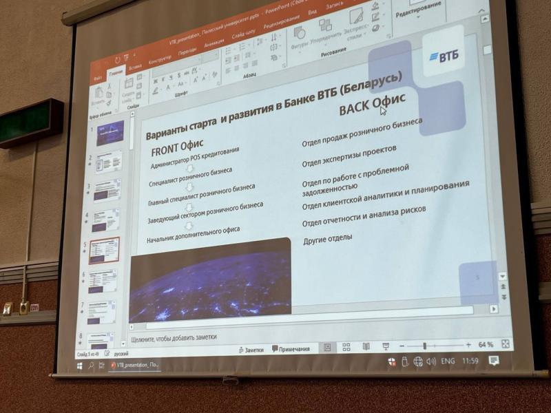 Представители банка поделились историей его развития и достигнутыми успехами. Студенты узнали о возможностях прохождения практики в банке, а также о том, как построить карьеру в команде ВТБ.