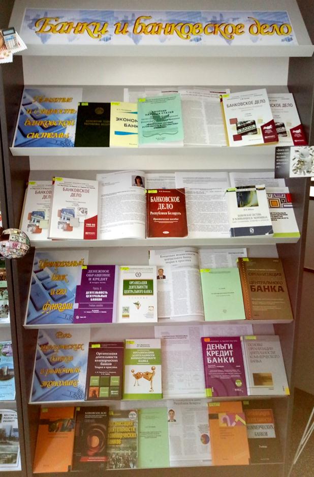 На выставке представлены монографии, научные издания, конференции, учебники, статьи, раскрывающие сущность функционирования банковской системы, механизм центрального банка, деятельность коммерческих банков, рассмотрены  основные виды банковских операций и сделок.