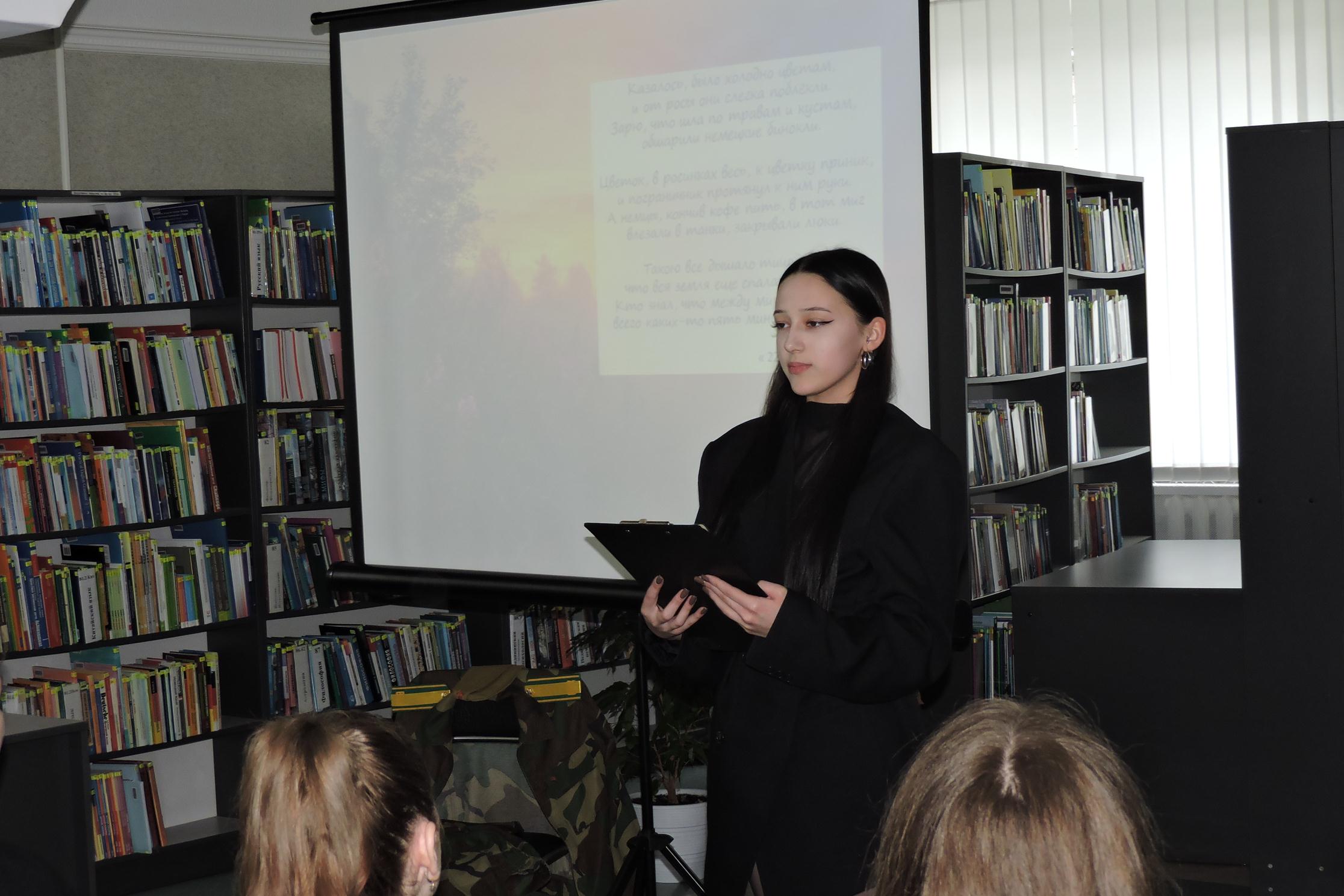 Стихотворения и отрывки из книг о войне, которые прозвучали в исполнении студентов группы 21Ф-1 Чайковской Анастасии, Конончук Дарьи, Радкевич Юлии, Тумилович Виктории, Свириденковой Ульяны, Саулич Алексея, Шамрило Юлии, Трусовой Алины, Хомяк Яны, видеофрагменты и ролики о сражениях и событиях Великой Отечественной войны завораживали зрителей, перенося их в то страшное, но значимое для истории нашей страны время. Воспоминания «со слезами на глазах» вызвали у зрителей бурю эмоций и оставили глубокое впечатление в сердце каждого из присутствующих в зале.
