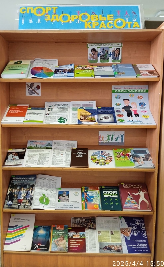 К этой дате на абонементе учебной литературы библиотеки (учебный корпус № 3, ул. Пушкина, 4, ауд. 3314) организована книжная выставка-рекомендация «Спорт, здоровье, красота». На выставке представлены книги, периодические издания и буклеты о здоровом образе жизни, правильном питании, режиме труда и отдыха, вредных привычках и многом другом.