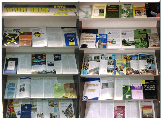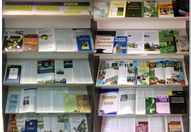 В читальном зале библиотеки учебного корпуса №1 оформлена книжная выставка «Высшая школа: вчера, сегодня, завтра», на которой представлены книги и научные статьи по проблемам развития высшего образования в Республике Беларусь. Публикации освещают мировые тенденции в образовательной сфере, инновационные процессы в области образования, историю и современное состояние ведущих вузов страны, роль университетов в мировом образовательном пространстве, раскрывают сущность Болонского процесса - процесса сближения и гармонизации систем высшего образования стран Европы.