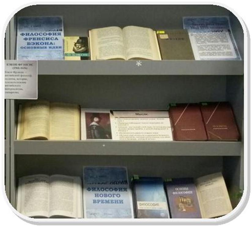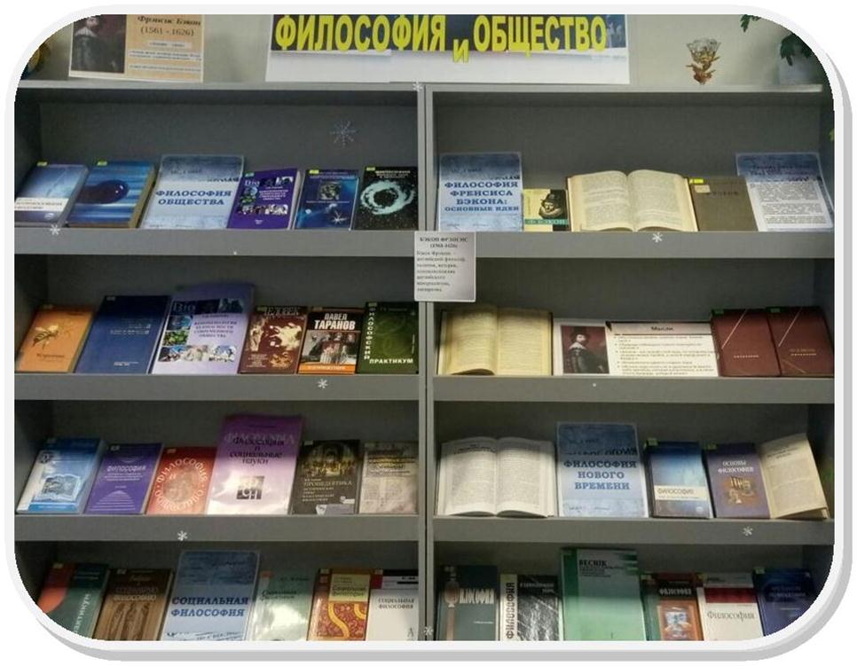 Выставка «Философия и общество» экспонируется в читальном зале библиотеки (учебный корпус №3) и  посвящена философии - особой форме познания мира, устанавливающей общие принципы бытия и принципы отношения человека к миру. На выставке представлены учебные, научные, научно-популярные  пособия, раскрывающие основные идеи философии, вопросы устроения общества, вопросы социальной философии.  Особое внимание уделено принципам философии Фрэнсиса Бэкона, английского политического деятеля и философа, основателя опытной науки и философии Нового времени, которому в январе исполняется 460 лет со дня рождения.