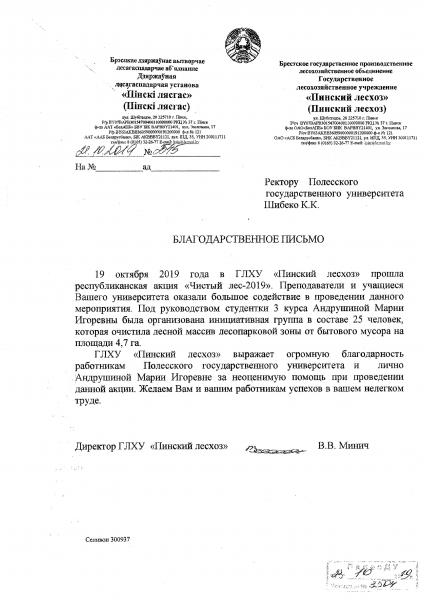 ГЛХУ «Пинский лесхоз» выражает огромную благодарность работникам Полесского государственного университета и лично Андрушиной Марии Игоревне студентке 3 курса биотехнологического факультета за неоценимую помощь при проведении республиканской акции «Чистый лес-2019».