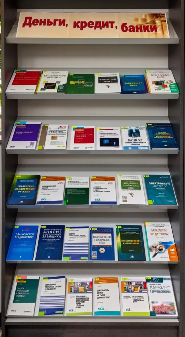 В читальном зале библиотеки учебного корпуса №1 организована книжная выставка «Деньги, кредит, банки». На ней представлена научная, учебная и учебно-методическая литература, в которой рассматриваются вопросы, раскрывающие сущность денежных и кредитных отношений в обществе: история появления и сущность денег, кредита и банков; построение денежных систем, организация денежного обращения и расчетов в современной экономике; теоретические аспекты организации кредита и кредитных отношений в обществе; история становления и особенности построения современной банковской системы; сущность и операции современных банков и небанковских кредитных организаций; основы организации валютных рынков и международных валютно-кредитных отношений; понятие, виды, характеристика современного рынка ценных бумаг, его участников и используемых инструментов.