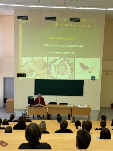 Декан факультета Маринич Татьяна Владимировна рассказала абитуриентам о поступлении на направления: «Физическая культура», «Физическая реабилитация и эрготерапия», «Тренерская деятельность», а также об олимпиаде для будущих студентов.