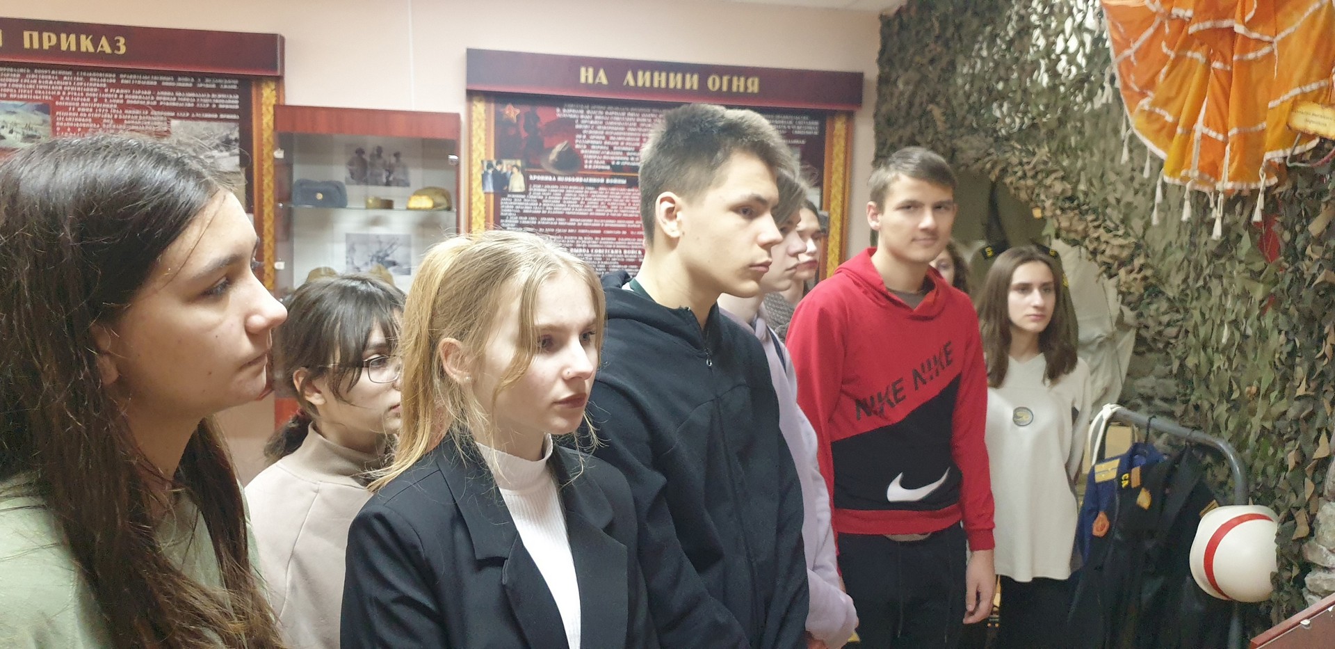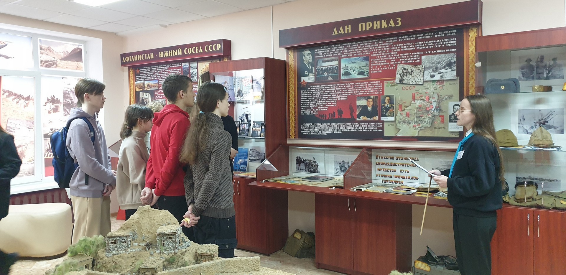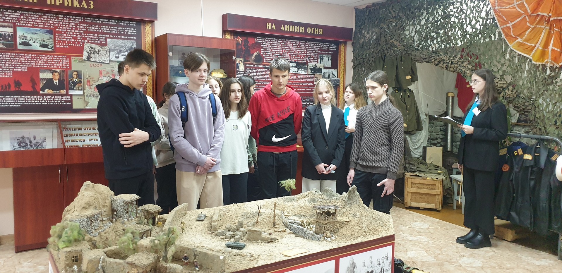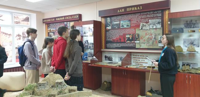 15 февраля, в день вывода советских войск из Афганистана, учащиеся лицея, проживающие в общежитии №5 ПолесГУ, посетили музейную комнату боевой славы воинов-интернационалистов в Афганистане Пинского колледжа УО «БрГУ имени А.С. Пушкина». Ребята познакомились с экспозициями музея, среди которых представлены более 400 экспонатов, за каждым из которых стоят судьбы людей, прошедших через пекло афганской войны, тех, кому посчастливилось вернуться, и тех, кто навечно остался лежать в песках Афганистана. Эти вещи погрузили ребят в атмосферу боевых действий. Учащиеся поблагодарили юных экскурсоводов за интересный и познавательный рассказ о подвиге воинов-интернационалистов.