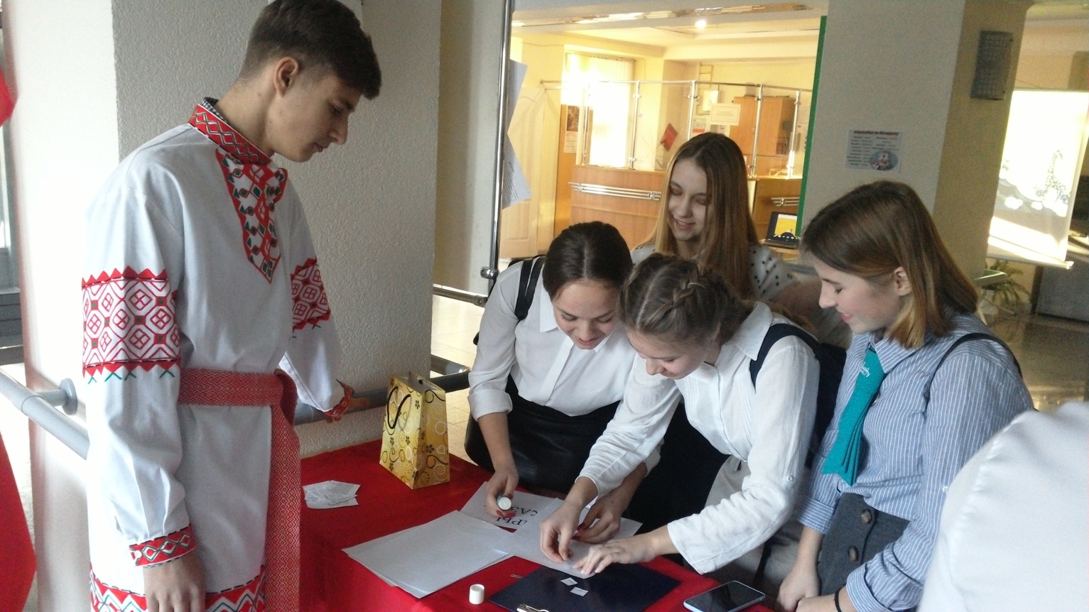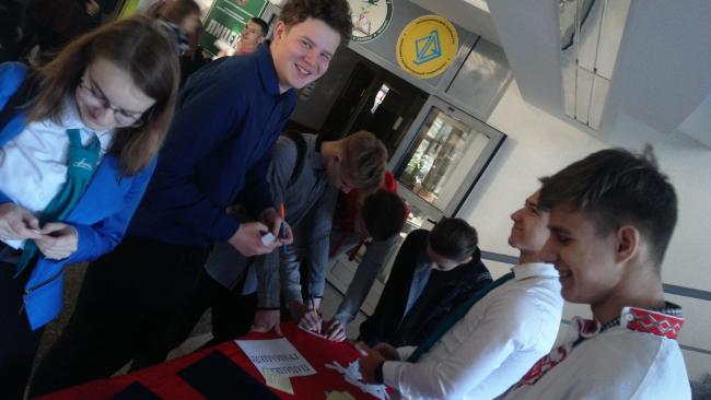 21 лютага , у Міжнародны дзень роднай мовы, у ліцэі прайшлі мерапрыемствы, падрыхтаваныя вучнямі 10 “В” класа разам з выкладчыкам беларускай мовы і літаратуры Магер Н.У. Сонечнае надвор’е дадало бадзёрага настрою і актыўнасці ўдзельнікам свята! Апранутыя ў нацыянальныя строі вучні-валанцёры правялі некалькі акцый: “Размаўляй з намі па-беларуску” (на пытанні па беларускай мове, літаратуры і гісторыі Беларусі трэба было адказаць па-беларуску), “Папацей, грамацей!” (успомніўшы правілы па арфаграфіі беларускай мовы, у прапанаваных сказах неабходна было ўставіць прапушчаныя літары), “Збяры прыказку” (з прапанаваных слоў скласці прыказку), “Любімыя словы”(складалі плакат, на якім кожны мог напісаць сваё улюбёнае беларускае слова), “Вершы ў кішэні” (за ўдзел ва ўсіх папярэдніх акцыях валанцёры дарылі аркуш з вершаванымі радкамі пра беларускую мову славутых мастакоў роднага слова). Напярэдадні свята ліцэісты атрымалі заданне перакласці на беларускую мову ўрывак з вядомага мультфільма “Трое из Простоквашино”. Што атрымалася, можна было ўбачыць і пачуць у час вялікага перапынку у вестыбюлі вучэбнага корпуса №2.