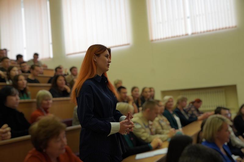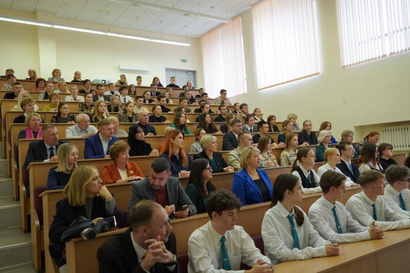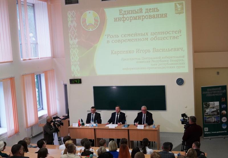 16 октября в Полесском государственном университете прошел Единый день информирования "Роль семейных ценностей в современном обществе" с участием Председателя Центральной избирательной комиссии Республики Беларусь Карпенко Игоря Васильевича. На мероприятии также присутствовали председатель Пинского горисполкома Ребковец Валерий Васильевич, ректор ПолесГУ Дунай Валерий Иванович, профессорско-преподавательский состав и студенты.