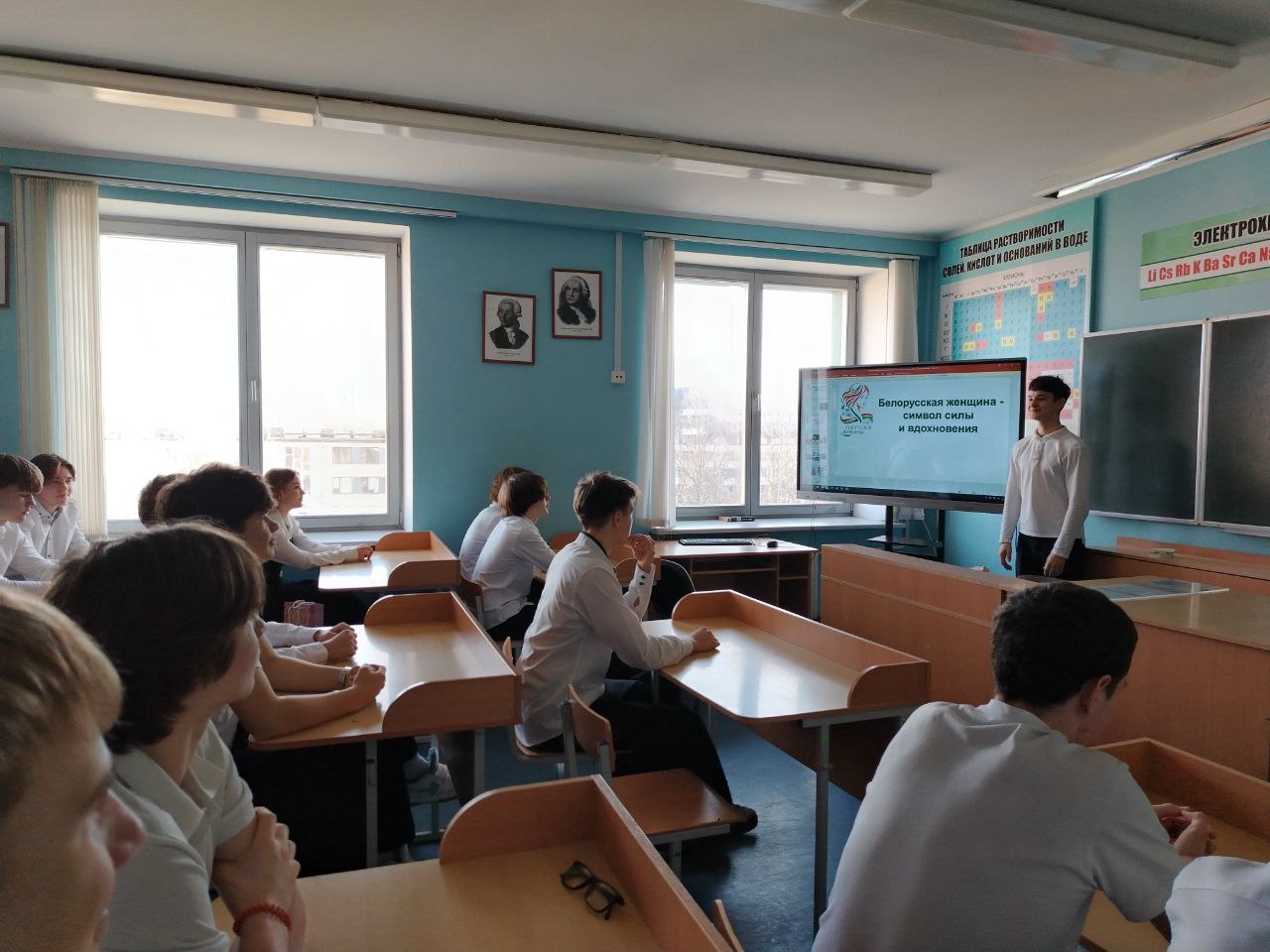 5 марта в лицее прошли единые уроки «Белорусская женщина – символ силы и вдохновения». Мероприятия были приурочены к прекрасному общереспубликанскому празднику – Дню женщин. На занятии педагоги и учащиеся говорили о глубокой и многогранной роли женщины в истории и современной жизни Беларуси. Основной акцент был сделан на том, что на протяжении веков белоруска была хранительницей домашнего очага и нравственным ориентиром общества, передавая из поколения в поколение мудрость, доброту и стойкость.
