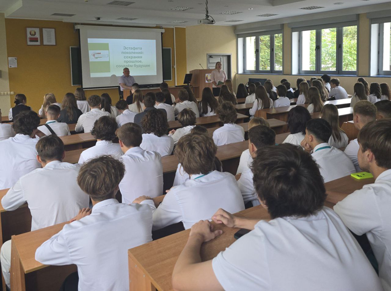 1 сентября в лицее прошел единый урок «Эстафета поколений: сохраняя прошлое, создаём будущее». Единый урок, посвященный Дню знаний, прошел в торжественной обстановке с участием председателя первичной организации ПолесГУ РОО «Белая Русь», старшего преподавателя кафедры социально-гуманитарных дисциплин ПолесГУ Макарушко Владимира Владимировича. Это событие стало важным шагом в формировании у учащихся уважительного отношения к истории, культуре и ценностям белорусского народа. В ходе урока напомнили учащимся о важности исторической памяти, национальных традиций, трудового наследия нашей страны.