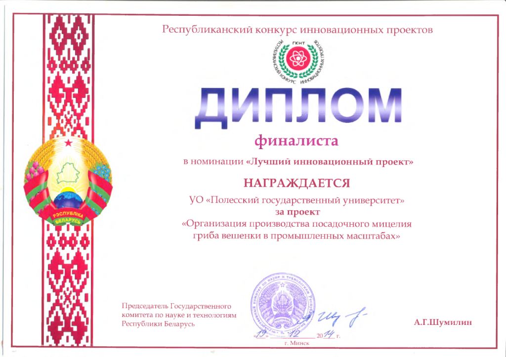 Поздравляем Полесский государственный университет с получением диплома финалиста Республиканского конкурса инновационных проектов в номинации «Лучший инновационный проект» «Организация производства посадочного мицелия гриба вешенки в промышленных масштабах». Проект подготовлен заведующей кафедрой биотехнологии, кандидатом биологических наук, доцентом Жук Ольгой Николаевной.