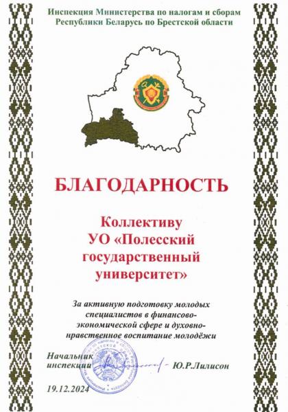 Инспекция Министерства по налогам и сборам Республики Беларусь по Брестской области выражает благодарность коллективу УО «Полесский государственный университет» за активную подготовку молодых специалистов в финансово-экономической сфере и духовно-нравственное воспитание молодежи.