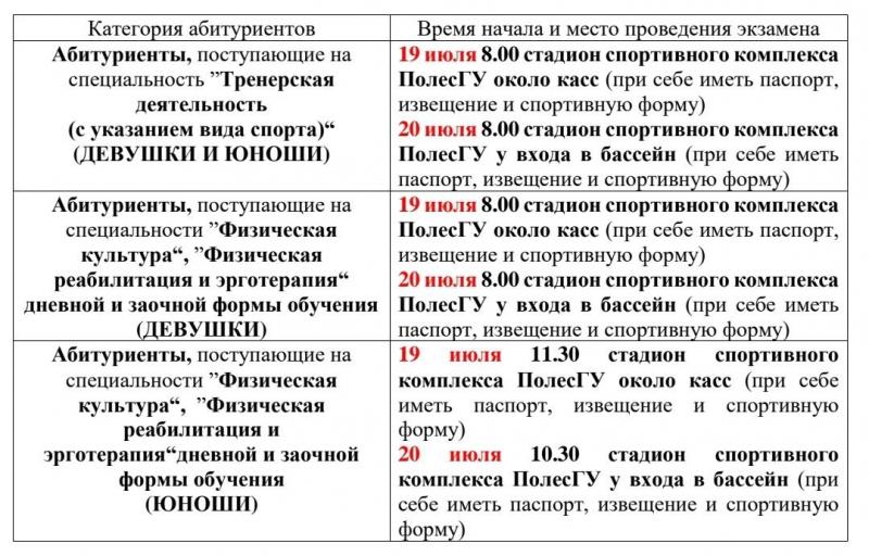 - 18 июля 2024 г. в 16.00 на консультацию по экзамену на стадион спортивного комплекса ПолесГУ (на трибуны);