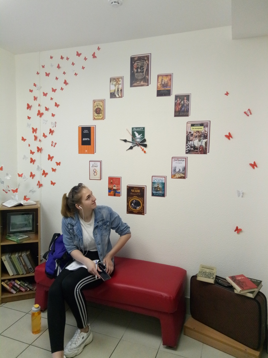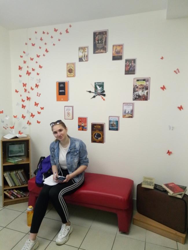 Сотрудники библиотеки создали небольшой арт-объект - фотозону в библиотеке. Теперь библиотечное время отсчитывают книжные часы, где каждая цифра взята из названия литературного произведения. Чемодан с книгами напоминает о времени отпусков и пляжном расслабленном чтении. А бабочки, вылетающие из книги, символизируют полет мыслей, грез, мечтаний, которые возникают во время чтения.