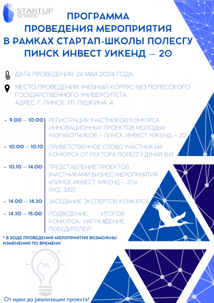 24 мая 2024 года в ауд. 3312 учебного корпуса № 3 ПолесГУ состоится конкурс инновационных проектов молодых разработчиков – ПИНСК ИНВЕСТ УИКЕНД – 20!