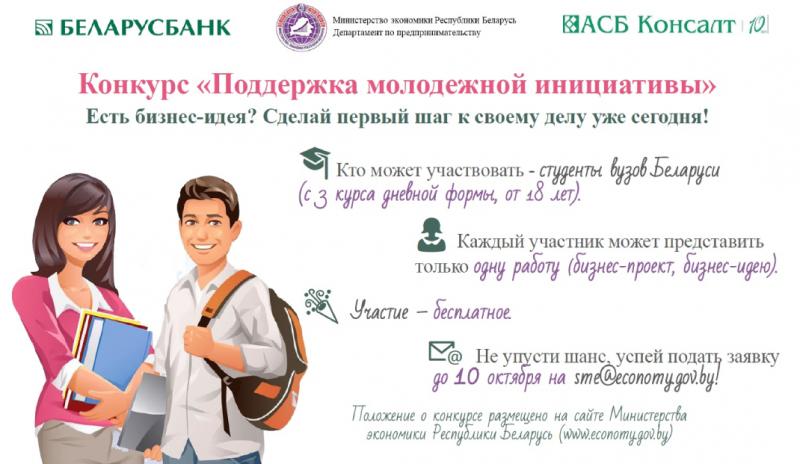 Министерство экономики совместно с ОАО «АСБ Беларусбанк» и ООО «АСБ Консалт» при поддержке Министерства образования объявляет о старте конкурса на лучшую бизнес-идею, бизнес-проект «Поддержка молодежной инициативы».