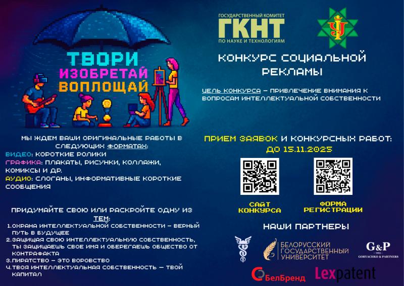 Национальный центр интеллектуальной собственности приглашает принять участие в конкурсе социальной рекламы в сфере интеллектуальной собственности «ТВОРИ, ИЗОБРЕТАЙ, ВОПЛОЩАЙ. 2025».