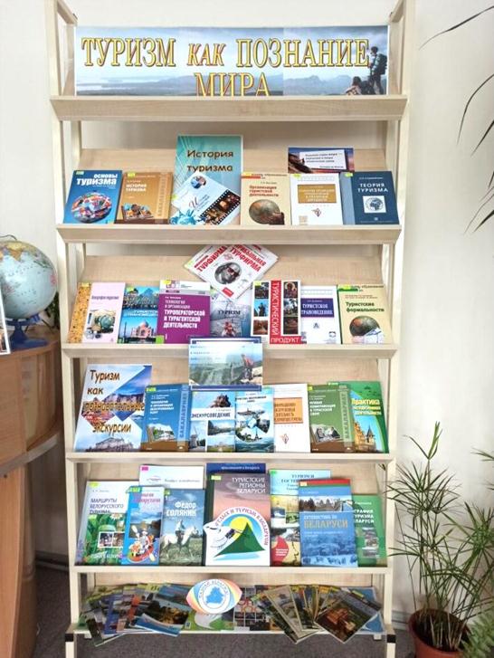 К этой дате в читальном зале библиотеки (учебный корпус №3, ауд. 3332) экспонируется книжная выставка «Туризм как познание мира». На выставке представлены учебники, учебные пособия по истории и географии туризма, организации туристической и экскурсионной деятельности. Представлена информация о туризме в Беларуси по таким направлениям, как историко-культурный, экологический, гастрономический, агроэкотуризм, санаторное лечение и др.