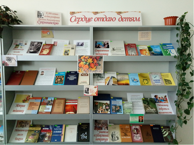 В преддверии Дня учителя, а также к 100-летнему юбилею выдающегося педагога-новатора В. А. Сухомлинского в читальном зале библиотеки учебного корпуса №3 оформлена книжная выставка  «Сердце отдаю детям». На выставке представлены основные работы В. Сухомлинского по теории и практике воспитания, труды педагогов-новаторов, книги по истории педагогики, а также литература, отражающая связь его педагогических идей с современностью. В рубрике «Образ учителя в художественной литературе» представлены книги об учителях и школьниках - произведения Чехова, Бунина, Алексина, Коласа, Айтматова, Распутина.