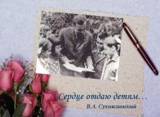 Василий Александрович Сухомлинский — педагог, писатель, создатель народной педагогики. Он сумел через идеи гуманной педагогики формировать и воспитывать духовные, гармоничные и счастливые личности. Сделать это ему помогла искренняя любовь к детям и убежденность в собственной правоте. Проработав всю жизнь учителем в сельской школе, он превратил ее в лабораторию педагогических методик. Его признали классиком гуманной педагогики прошлого века. В.А. Сухомлинский разработал комплексную эстетическую программу «воспитания красотой». Его идеи были воплощены в практике многих школ, созданы Международная ассоциация и Международное объединение исследователей В.А. Сухомлинского, педагогический музей в Павлышской школе.  В.А. Сухомлинский – автор 30 книг и 500 статей, посвящённых воспитанию и обучению. Книга его жизни – «Сердце отдаю детям». Многие талантливые учителя выбрали свою профессию после чтения книг Сухомлинского.