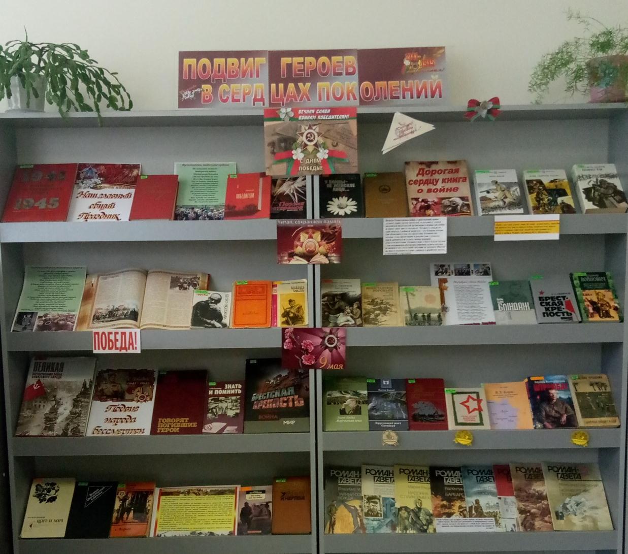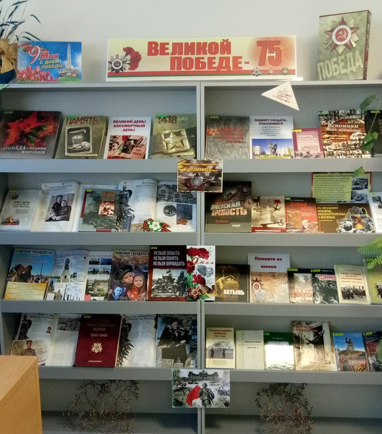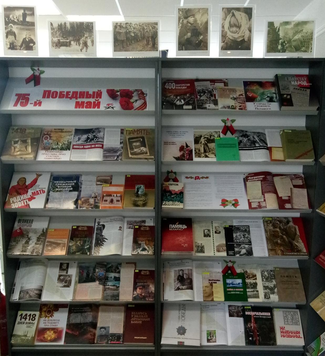 К 75-летию Победы в Великой Отечественной войне библиотека организовала книжно-иллюстративные выставки «75-й Победный май» (читальный зал, учебный корпус №1), «Великой Победе – 75» (читальный зал, учебный корпус №3), «Подвиг героев в сердцах поколений» (абонемент научной и художественной литературы, учебный корпус №3). На них представлены журналы, фотодокументы, книги документального содержания, энциклопедии, справочники, литературные произведения о самоотверженной солдатской стойкости, героических подвигах, о фронтовых буднях рядовых бойцов, воспоминания участников Великой Отечественной Войны, историй людей, так или иначе связанных с войной.