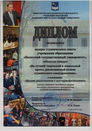 Одним из главных мероприятий форума был «Конкурс на лучший творческий и социальный проект, реализованный силами студенческого самоуправления. Студенты Полесского государственного университета также приняли участие в конкурсе и были награждены дипломом за победу в номинации «Проект, реализованный в вузе-партнере/колледже». Благодаря этому конкурсу у наших студентов появилась возможность обменяться опытом, идеями по внедрению и осуществлению проектов, направленных на развитие молодежи, и укреплению взаимоотношений университетов друг с другом.