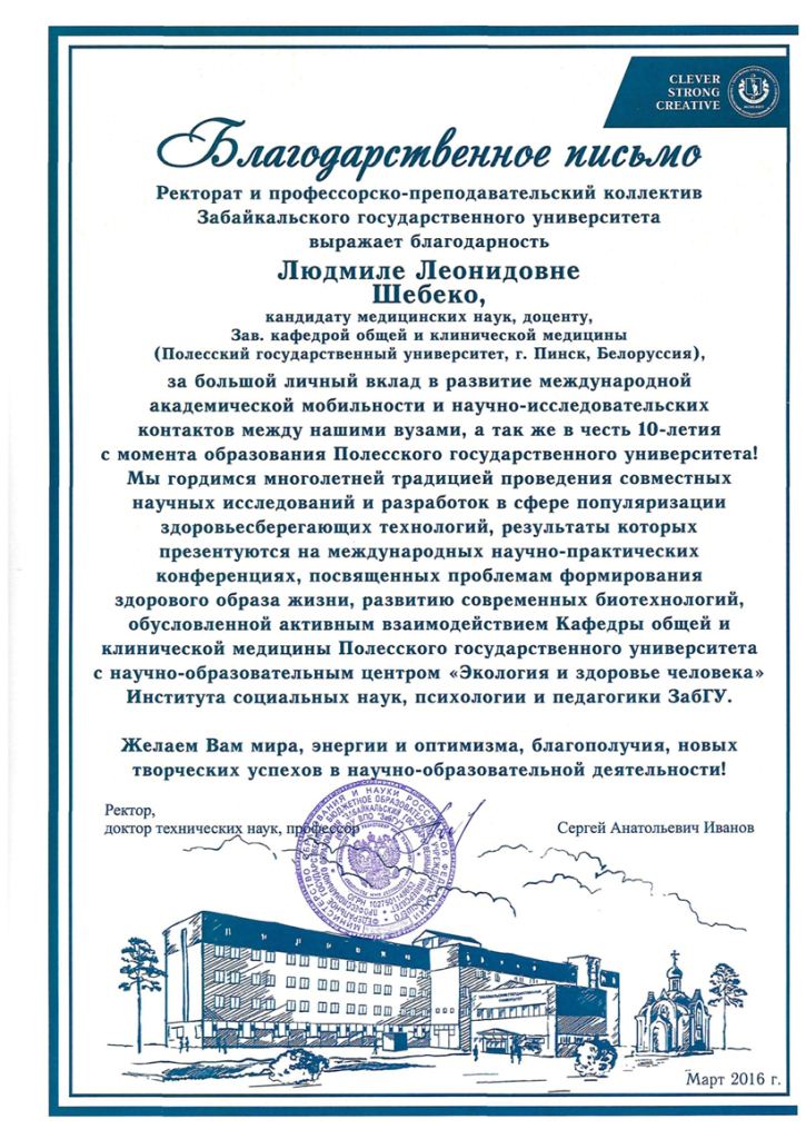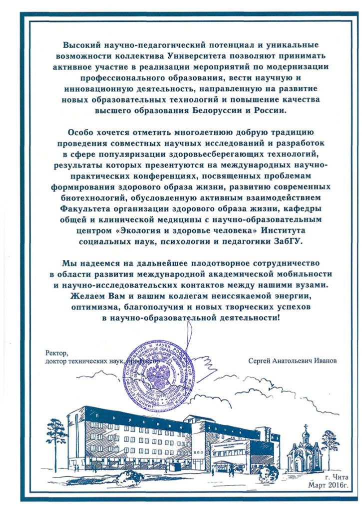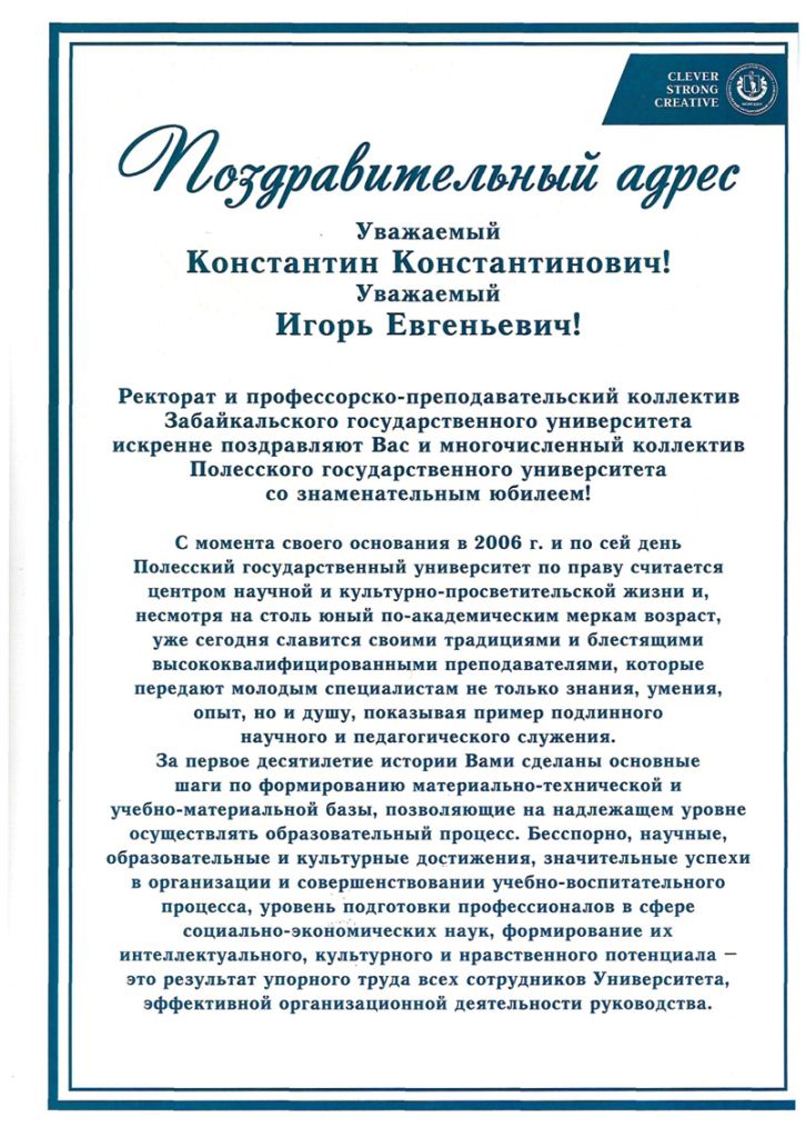 Он отметил, что университет с момента своего основания в 2006 году и по сей день по праву считается Центром научной и культурно-просветительской жизни, славится своими традициями и блестящими высококвалифицированными преподавателями. Особо Сергей Анатольевич отметил многолетнее и эффективное сотрудничество между Забайкальским и Полесским государственными университетами. Он пожелал всем сотрудникам и студентам университета неиссякаемой энергии, оптимизма, благополучия и новых творческих успехов в научно-образовательной деятельности и передал (в электронном виде) Поздравительный адрес и благодарственные письма!