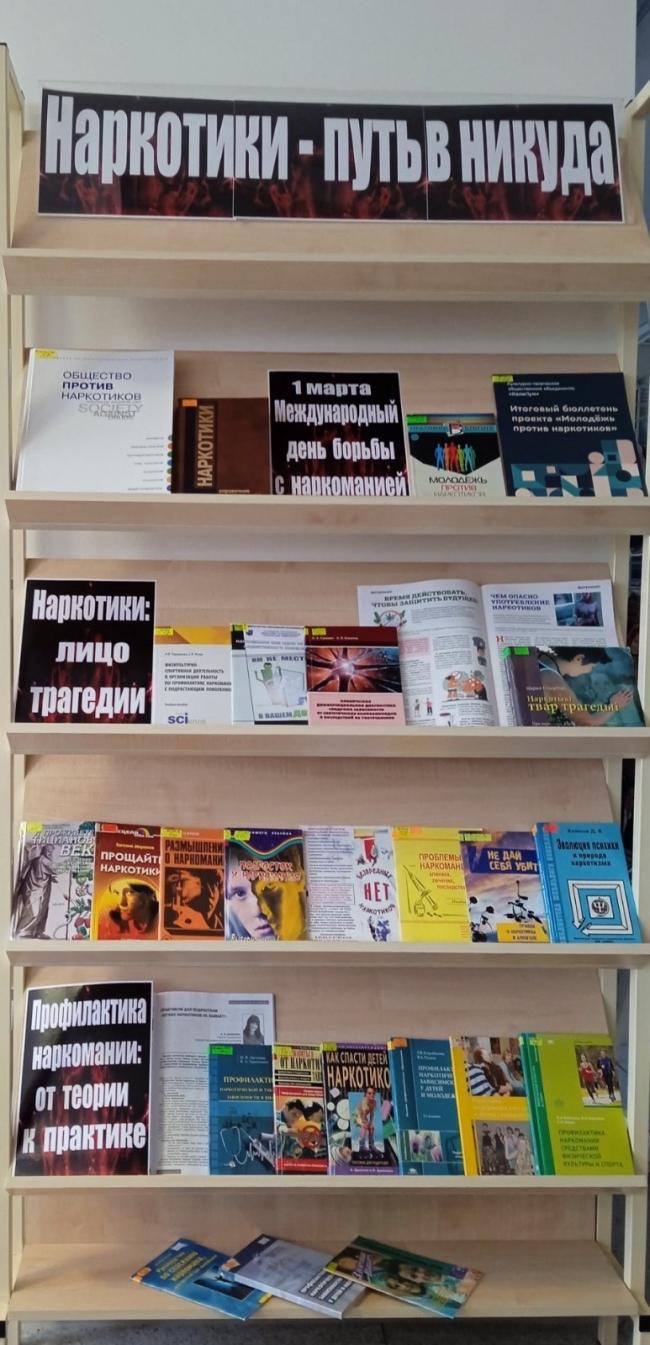 В современной жизни тема наркомании очень актуальна, так как все больше и больше людей втягивается в эту беду, и как это ни трагично, в рядах наркоманов очень много молодежи. За секундные псевдоудовольствия – РАСПЛАТА ЖИЗНЬ! Употребление наркотических и токсических препаратов ведет к моральной деградации личности, физически разрушает организм и приводит в итоге к смерти. Именно поэтому и был учрежден Международный день борьбы с наркоманией и незаконным оборотом наркотиков, напоминающий всему человечеству об этом страшном недуге. К этой дате в читальном зале (учебный корпус № 3, ул. Пушкина, 4, ауд. 3332) оформлена книжная выставка-предупреждение «Наркотики – путь в никуда». Представленные на выставке книги, журнальные статьи помогут найти ответы на многие вопросы: кто и как затягивает молодежь в наркотический омут, как противостоять тем, кто предлагает попробовать психоактивные вещества, есть ли будущее у наркомана.
