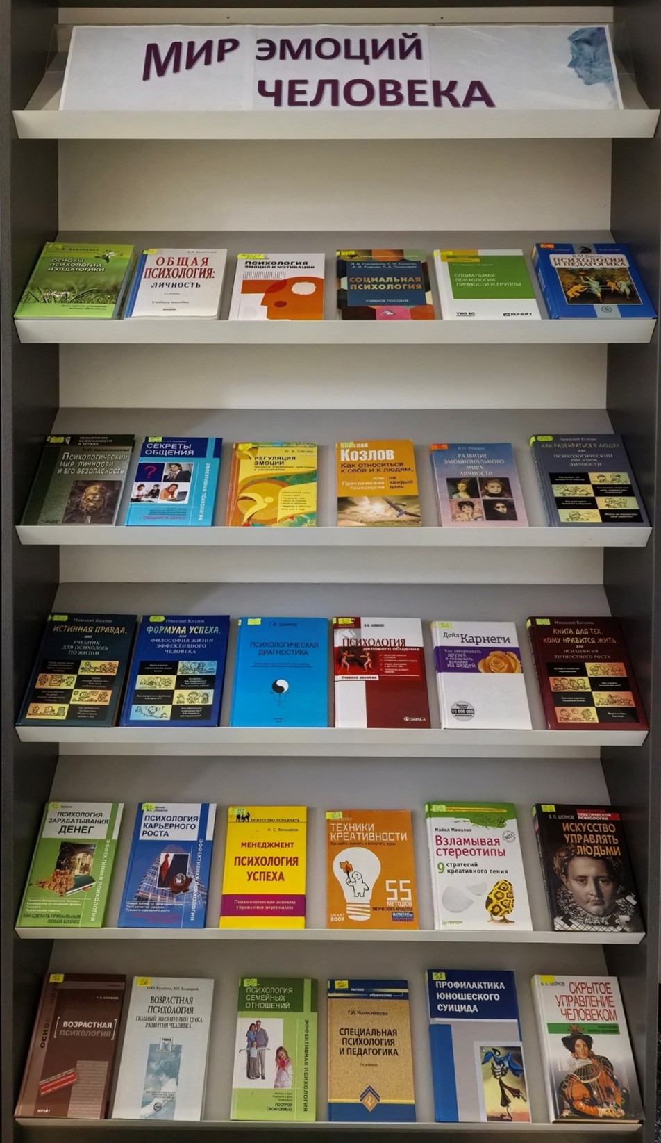 В библиотеке учебного корпуса №1 организована книжная выставка «Мир эмоций человека» На выставке представлена литература, в которой раскрываются проблемы личностного развития и поведения, излагаются психологические основы общения, взаимодействия между людьми в различных сферах жизни с учетом их темперамента и характера.