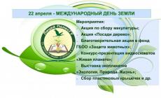 Каждый год 22 апреля отмечается не просто большой, а поистине глобальный праздник — Международный день Матери-Земли (International Mother Earth Day) — день нашего общего уютного дома. Главное назначение мероприятий, инициированных в эти дни — привлечение внимания жителей всего мира к проблемам экологии, окружающей среды и защиты животных. Лицеисты поддержали традицию празднования Дня Земли и организовали в лицее ряд мероприятий: акция по сбору макулатуры; акция «Новая жизнь в обмен на крышечки»; акция «Посади дерево»; благотворительная акция в фонд ГБОО «Защита животных»; конкурс-презентация видеосюжетов «Живая планета»; выставка-конкурс экоплакатов «Экология. Природа. Жизнь»; фотовыставка «Наши домашние питомцы», экологический интеллектуальный марафон.