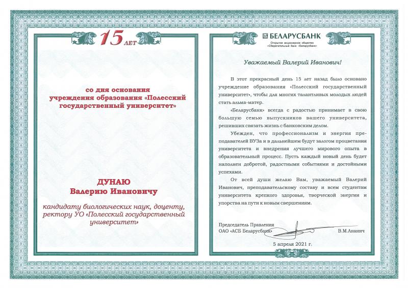 5 апреля А.Ф. Хлебус., и.о. директора Центра банковских услуг №121 ОАО «АСБ Беларусбанк», от лица Председателя Правления ОАО «АСБ Беларусбанк» В.М.Ананича поздравил ректора В.И. Дуная с 15-летием создания УО «Полесский государственный университет».