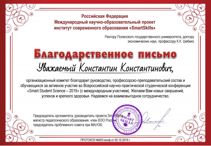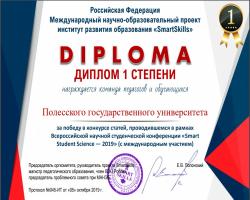 Дипломом 1 степени награждена команда педагогов и обучающихся Полесского государственного университета за победу в конкурсе статей, проводившемся в рамках Всероссийской научной студенческой конференции ˮStudent Science – 2019“.