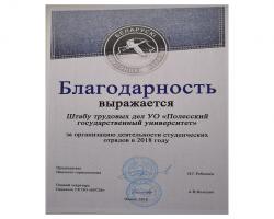 Выражается БЛАГОДАРНОСТЬ Штабу трудовых дел УО "Полесский государственный университет" за организацию деятельности студенческих отрядов в 2018 году.
