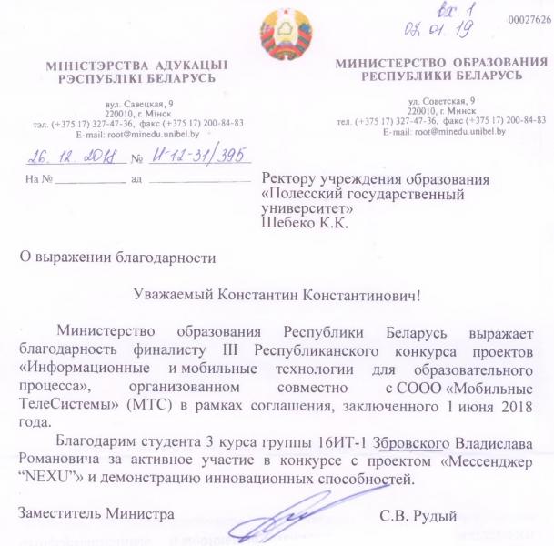 За активное участие с проектом «Мессенджер «NEXU» в III Республиканском конкурсе проектов «Информационные и мобильные технологии для образовательного процесса» Заместитель Министра образования Республики Беларусь, Сергей Валентинович Рудый, выражает благодарность Владиславу Романовичу Зборовскому, студенту факультета банковского дела Полесского государственного университета, финалисту Конкурса.