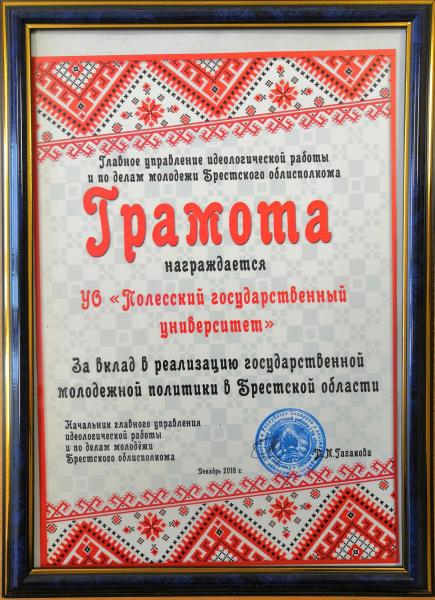 УО "Полесский государственный университет" награждается за вклад в реализацию государственной молодежной политики в