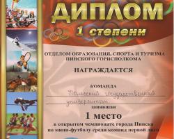 Студенты Полесского государственного университета приняли участие в открытом чемпионате города Пинска по мини-футболу. На участие в чемпионате было заявлено 18 команд. После предварительных игр две команды от Полесского государственного университета продолжили борьбу в первой лиге в составе 10 команд.