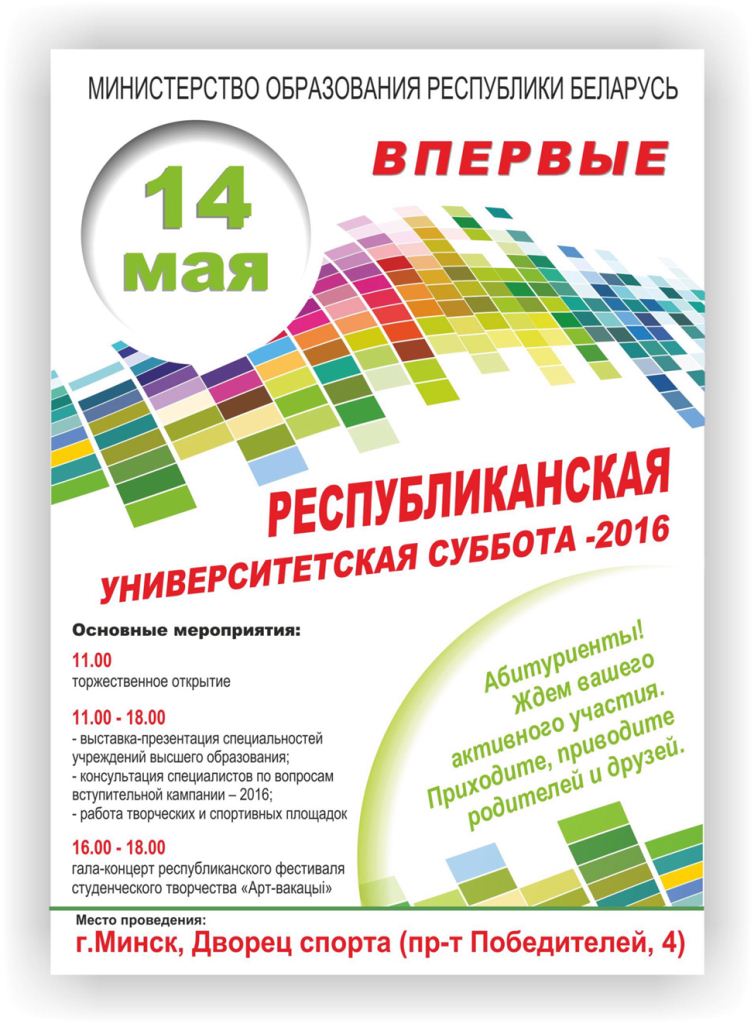 14 мая 2016 года во Дворце спорта в Минске прошла Республиканская университетская суббота, в которой приняла активное участие делегация Полесского государственного университета в составе: проректора по воспитательной работе Соколовой С.Н., декана экономического факультета Збориной И.М.; декана биотехнологического факультета Волотовича А.А.; заместителей декана факультета банковского дела Ярович О.Н., Синкевич А.И., Хрусь Е.А.; заместителя декана факультета организации здорового образа жизни Гаврилик М.В.; начальника управления информационных технологий Пигаля П.Б., начальника отдела воспитательной работы с молодежью Приборович Е.А.; педагогов-организаторов Матвеюк Н.А., Тарансо И.Д., Горбачевской С.Л.