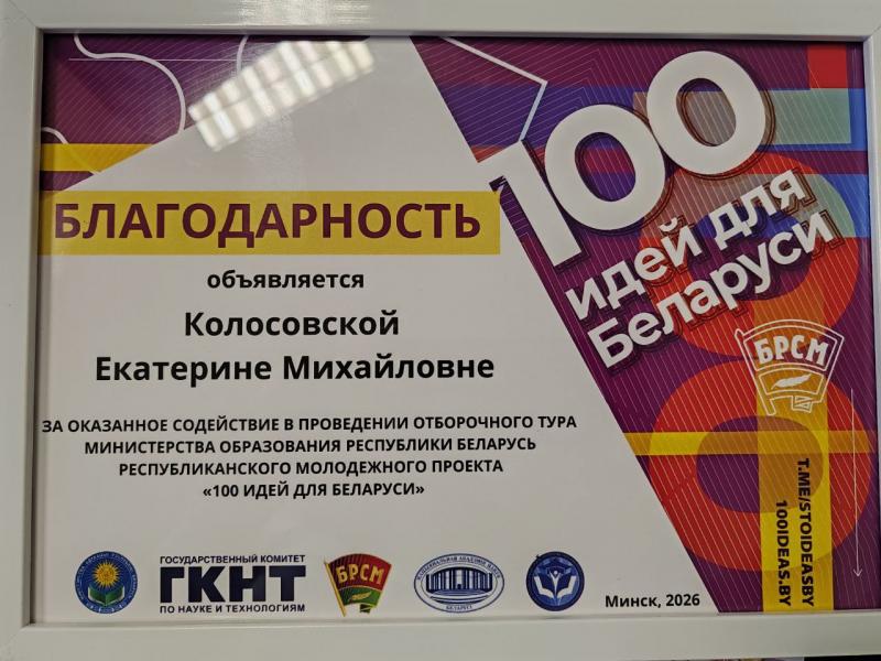 Председатель Совета молодых ученых ПолесГУ Екатерина Михайловна Колосовская выступила экспертом в секции "Лучшая бизнес-идея" и была награждена Благодарностью за содействие в проведении отборочного тура Министерства образования Республики Беларусь республиканского молодежного проекта "100 идей для Беларуси".