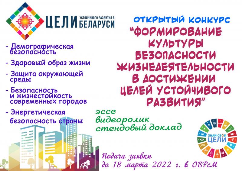 Открытый конкурс «Формирование культуры безопасности жизнедеятельности в достижении целей устойчивого развития» проходит в Университете гражданской защиты МЧС. Он проводится в рамках реализации Национальной стратегии устойчивого социально-экономического развития Республики Беларусь на период до 2030 года, Национальной стратегии по снижению риска возникновения чрезвычайных ситуаций в Республике Беларусь на 2019–2030 годы, Государственной программы «Образование и молодежная политика» на 2021–2025 годы и направлен на привлечение внимания молодежи к Целям устойчивого развития, а также формирование у обучающихся мотивации к активным действиям по их достижению.