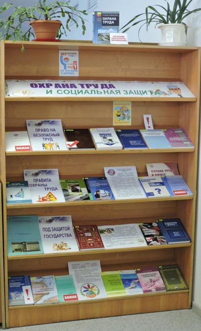 На выставке представлены учебники, учебные пособия, нормативные документы в области охраны труда и социальной защиты. Выставка состоит из трех разделов. В первом разделе «Право на безопасный труд» содержится правовая литература, касающаяся вопросов по охране труда. Во втором разделе «Правила охраны труда» представлена литература по вопросам, касающихся обеспечения техники безопасности при выполнении работ, аттестации рабочих мест на современных предприятиях. Третий раздел “Под защитой государства”раскрывает понятие и содержание социальной защиты работников на предприятиях, гарантий прав работников, контроля в сфере охраны труда.