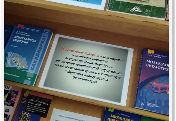 «Она похожа на… штопор. Она похожа на оконное стекло. Она плавится, но не так, как лед. Она похожа на путь человека, заблудившегося в лесу...» — вряд ли с первого раза можно угадать, что речь идет о молекуле ДНК. О строении клетки, биохимических процессах, макромолекулах, генах, вирусах и других биологических объектах вы можете узнать из материалов, представленных на книжной выставке «Биологическая химия и молекулярная биология». Выставка экспонируется на абонементе учебной литературы (учебный корпус №3, ауд. 3214)
