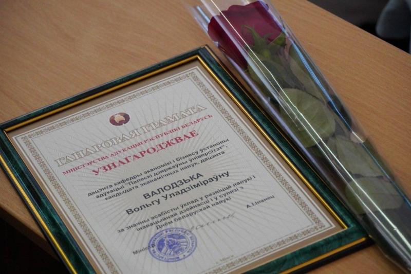 На торжественном собрании, посвящённом 20‑летию Полесского государственного университета, Ольга Владимировна была удостоена Почётной грамоты Министерства образования Республики Беларусь за значительные достижения в научной деятельности и весомый вклад в развитие университета.