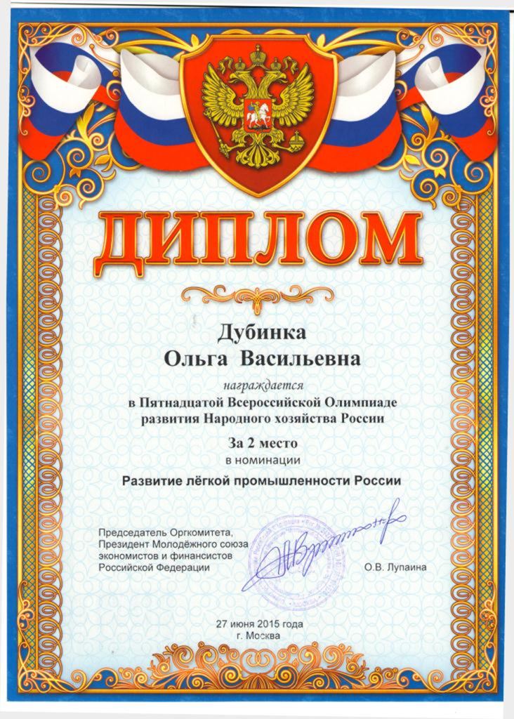 Дубинка Ольга Васильевна, выпускница 2015 года экономического факультета, специальность маркетинг Диплом Пятнадцатой Всероссийской Олимпиады развития Народного хозяйства России за 2 место в номинации Развитие легкой промышленности России ![]() |
